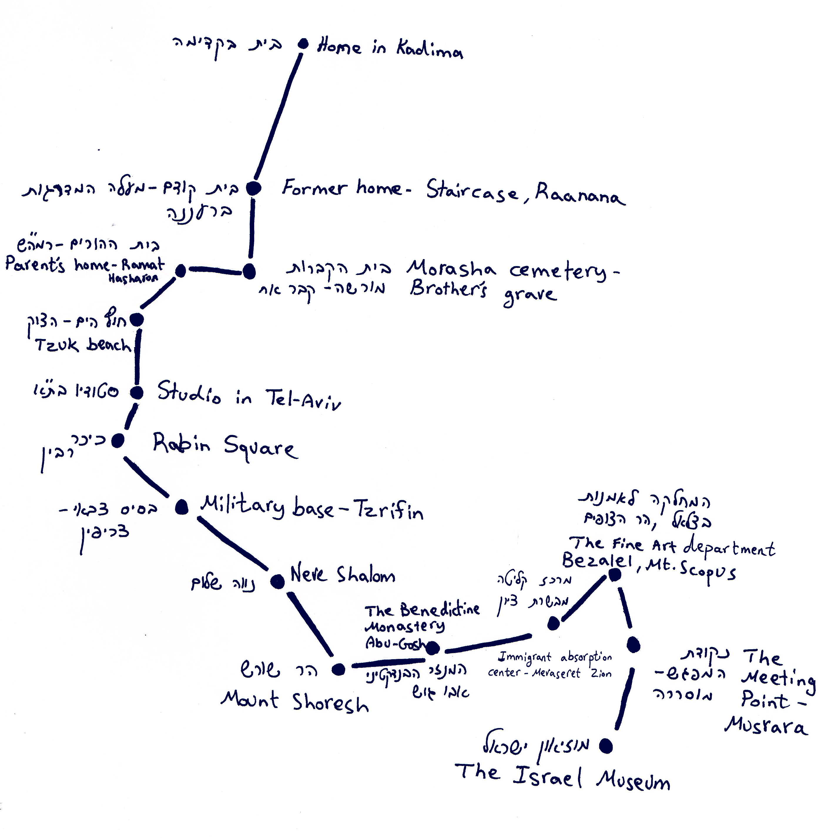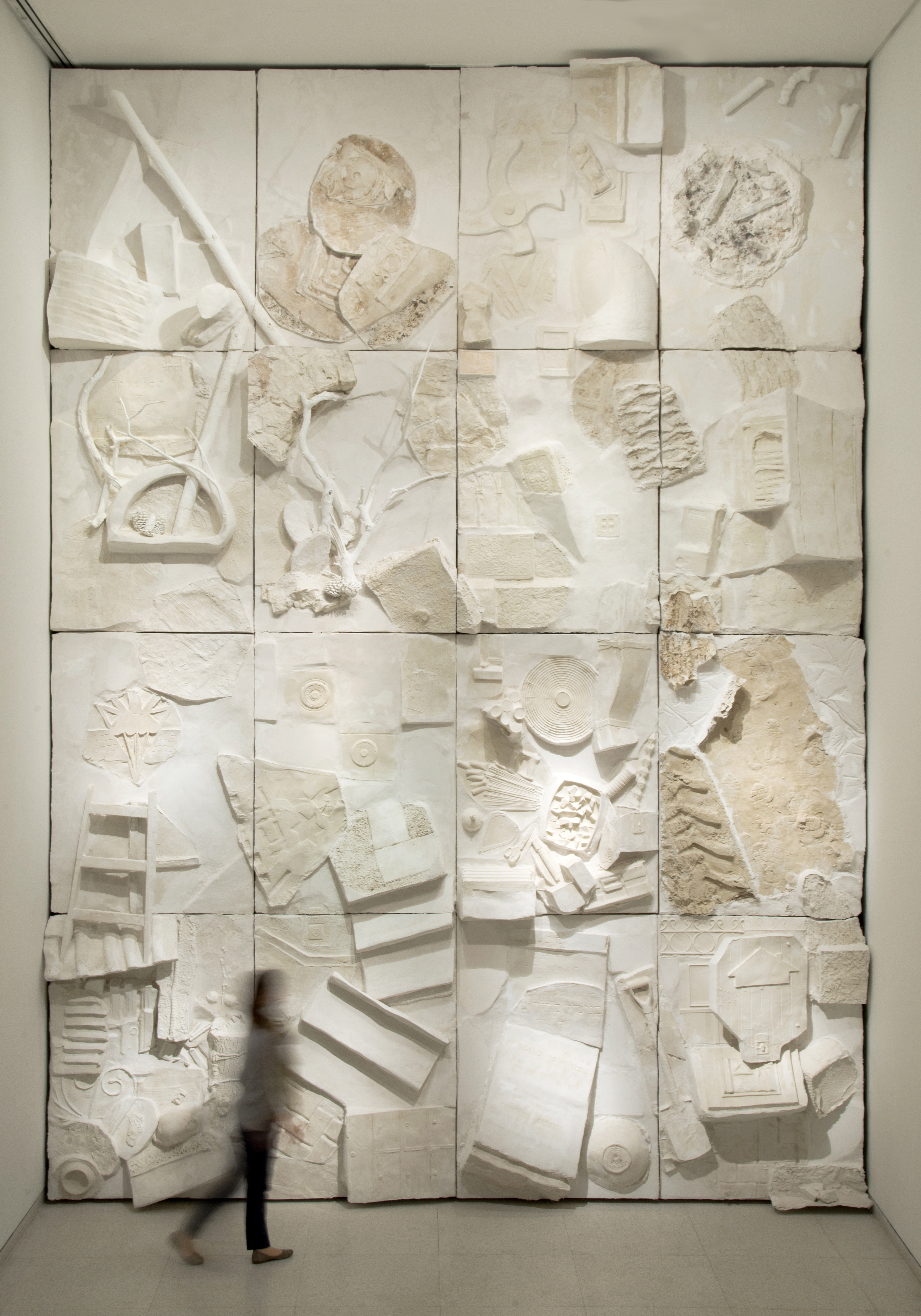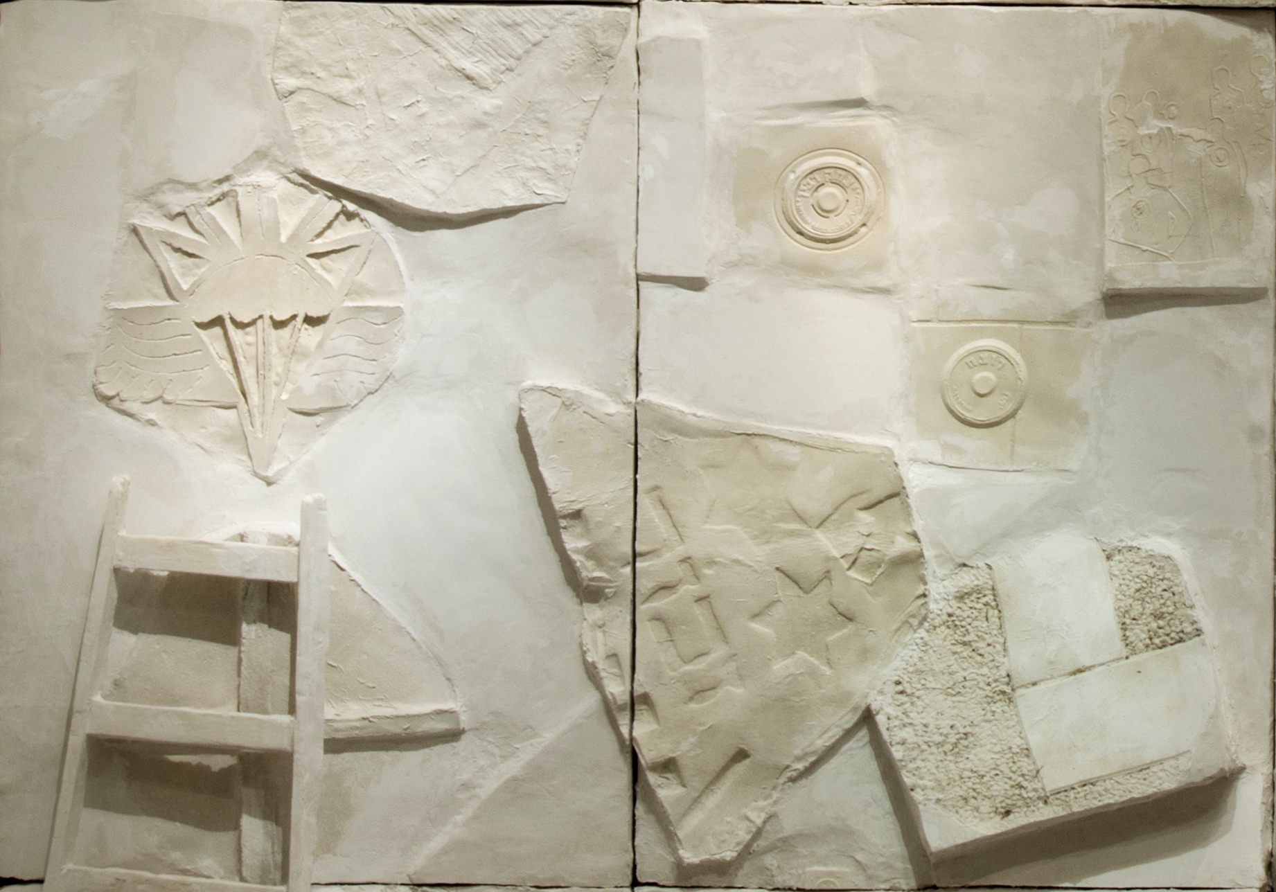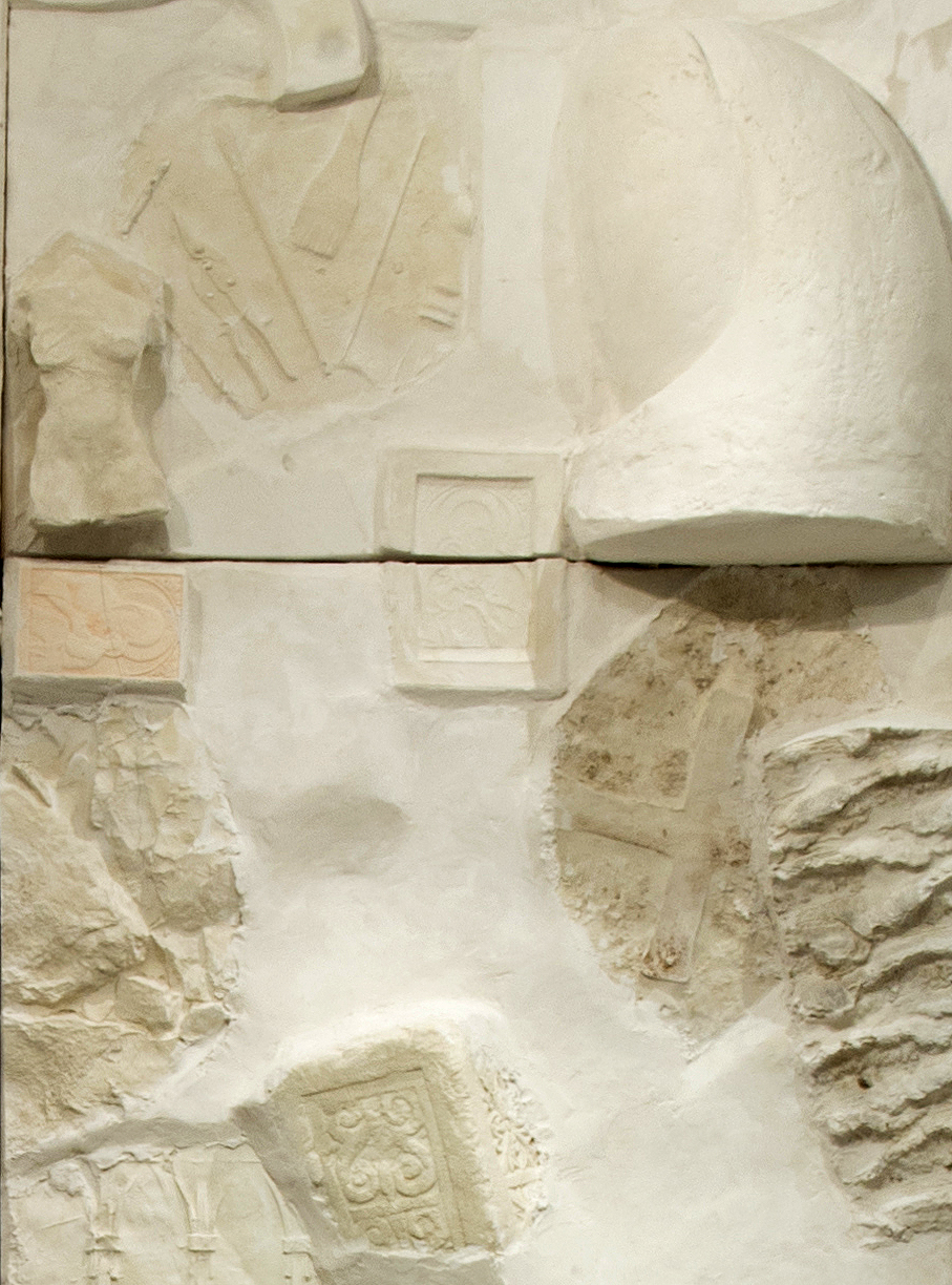 “A day passes and another day comes” is a very large plaster relief (6m x 8m) suited to a specific wall in the Israel museum. The relief consists of many cast objects which were created during a ten day walk of pilgrimage that took place from my home (near Netanya) to the Israel museum (85 miles). The various objects were assembled together into 16 large frames, painted to white and fixed to the wall.